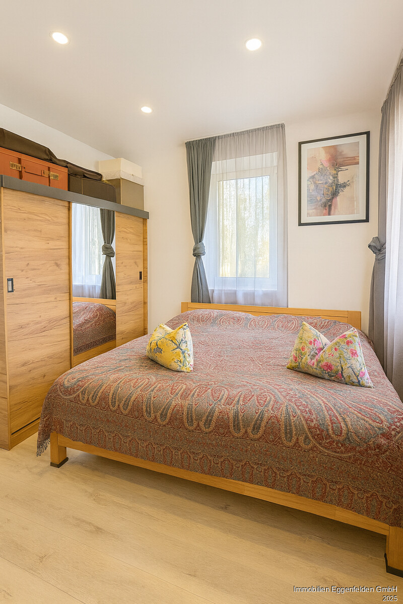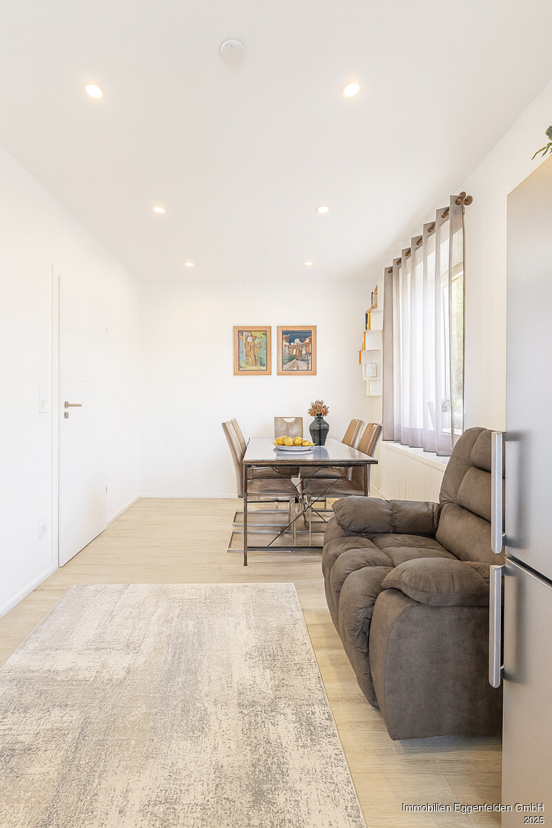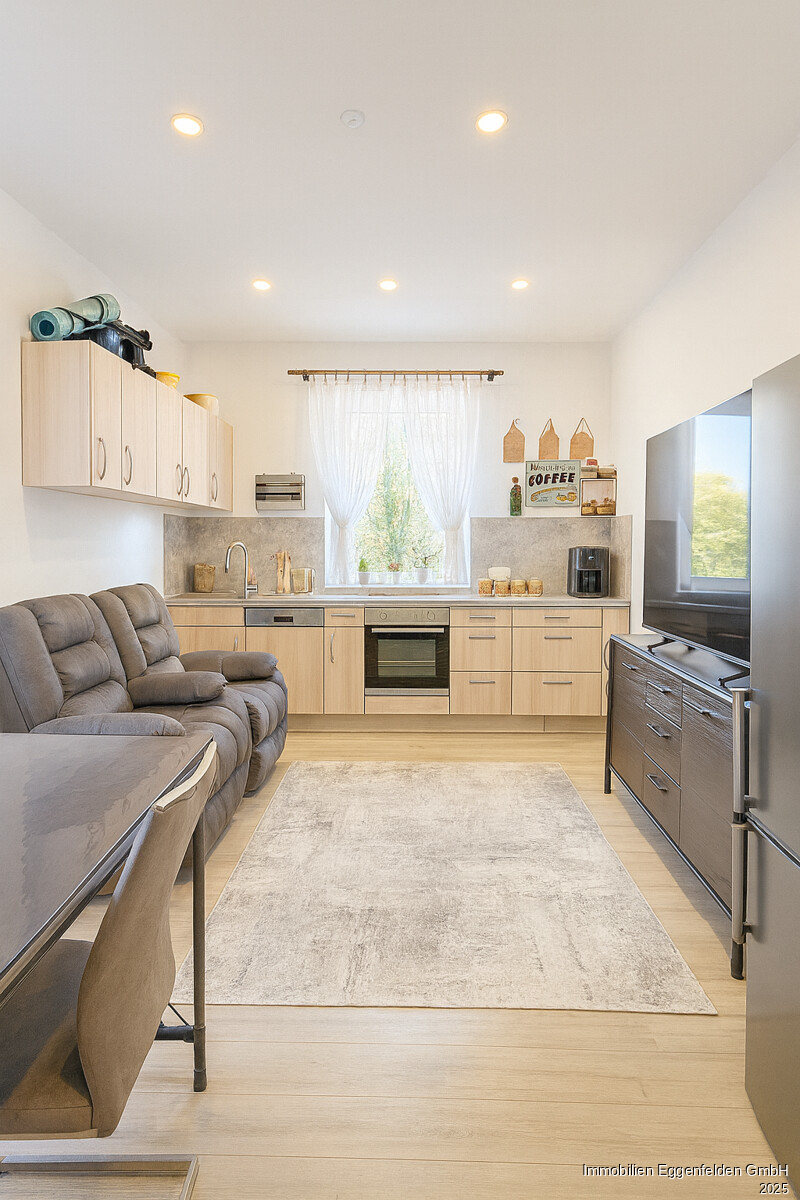 Im offenem Essbereich besticht die helle Küchenzeile durch ihr modernes Design und lädt nicht zuletzt durch die gute Ausstattung der Elektrogeräte zum gemeinsamen Kochen ein. Derzeit wird der Raum als offener Wohn- Essbereich mit Couch und Esstisch genutzt. Möglich wäre auch Platz für Besucher an einer gemütlichen Sitzecke im Eingangsbereich des Raumes, wenn man bei Bedarf die Küche beispielsweise durch einen Frühstückstresen erweitern würde oder für die schnellen Mahlzeiten, eine gemütliche, kleine Bistroecke schafft.