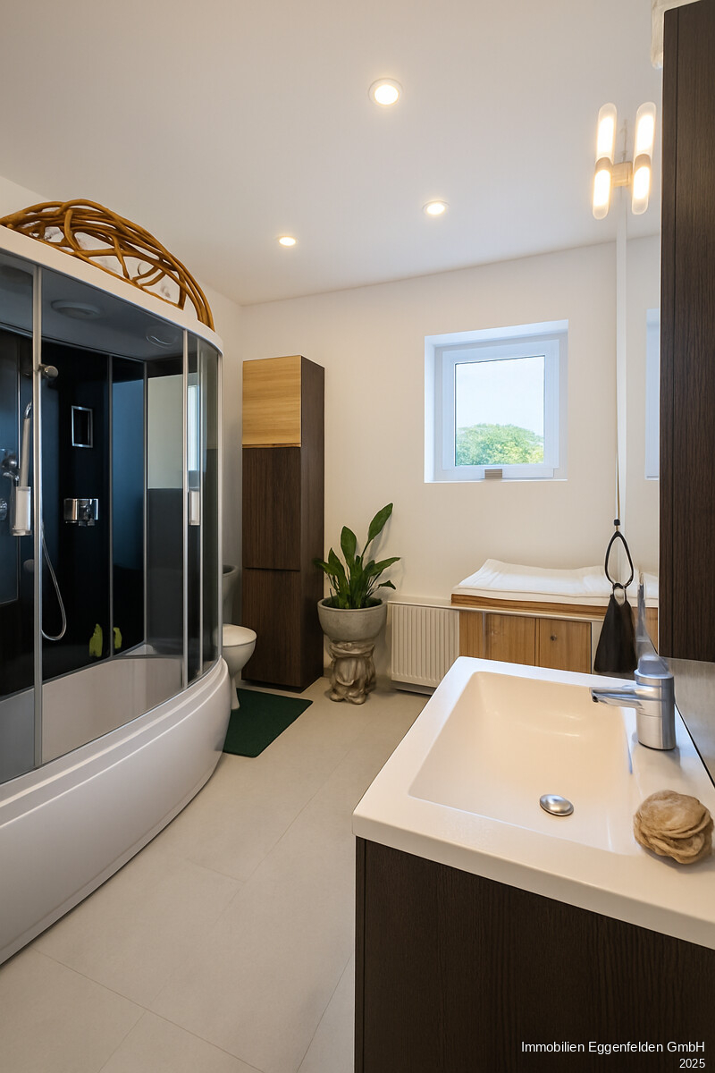 Besonderes Highlight ist das Badezimmer mit kleinem, eigenem Wellnessbereich. Der hoch moderne Duschtempel mit integrierter Badewanne garantiert höchste Entspannung und ist ein absoluter Blickfang. Stimmige Einbaumöbel und klassische sanitäre Einrichtung, sowie das Tageslichtfenster, machen den großzügigen Raum zu einem wertvollen Ort des Alltages, der keine Wünsche offenlässt. Waschmaschinenanschluss und Platz für einen Trockner besteht ebenfalls.