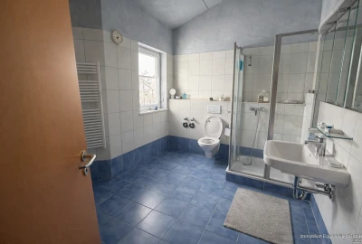 Auch das Badezimmer besticht durch seine Größe und die anmutige Raumhöhe. Ausgestattet ist es mit einer Badewanne, Dusche, sowie WC, Waschbecken und einer elektrischen Handtuchheizung.